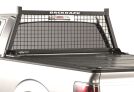 Has welded wire mesh to provide full window protection. Has wider carrying capacity above cab. Each intersection of wire is welded to avoid rattling and provide strength. Less flexibility to mount accessory light brackets than the BACKRACK(TM). Is more expensive than the BACKRACK(TM). Sits higher above the cab than the BACKRACK(TM).