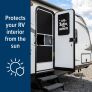 Camco's Life is Better at the Campsite RV Door Window Light Blocking Shade protects your RV interior from the sun and helps keep the interior temperature cooler in hot weather. This shade also provides additional privacy by blocking unwanted outside views. The fun design features large “Life is Better at the Campsite” text with retro stars. Product measures 25 ¼-inches (L) x 16 ¼-inches (W) and is made of black nylon ripstop with a silver reflective backing. Includes hook and loop fasteners for easy installation.