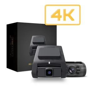 4K UHD (2160p) dash camera system including front and rear cameras. Supports 3rd-channel camera when front camera is in 2K mode (firmware update required). Featuring "Eco" battery saving technology for 90% current draw reduction while parked. Includes 64GB memory card and built-in GPS/speed antenna.