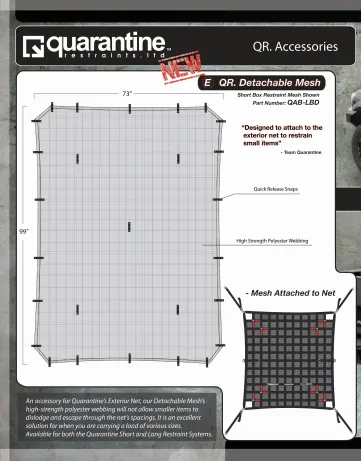Dimensions: 73" Width x 99" Length. Mounts to net. This product is made of high-quality materials to serve you for years to come. Designed using state-of-the-art technology and with customers in mind. It will meet your needs and deliver great quality at an affordable cost. This product is made of high-quality materials to serve you for years to come. Designed using state-of-the-art technology and with customers in mind, this product by Quarantine will last a lifetime. It will meet your needs and deliver great quality at an affordable cost.