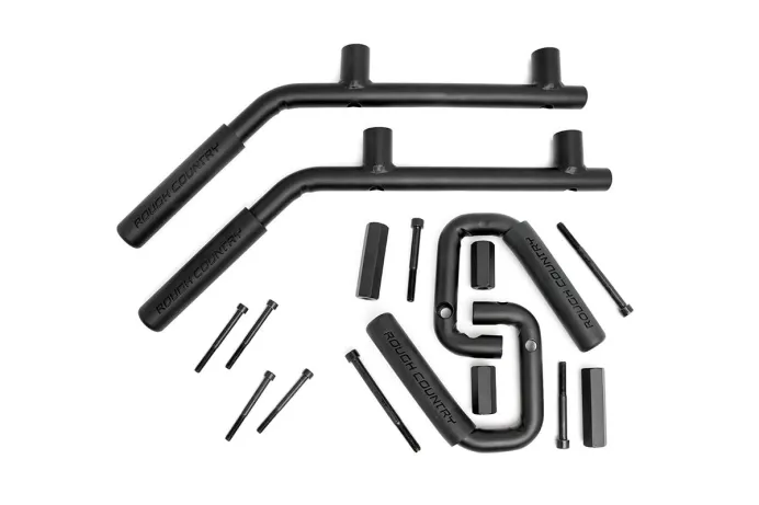 Gain easier access for getting in and out of your lifted Jeep JK with Rough Country's Solid Steel Front and Rear Grab Handles. These heavy-duty grab handles are incredibly easy to install, and offer an easy way to climb into your cab and a convenient place to hang on when taking to the trails. Our newly redesigned handles are made with a thicker, high-quality, 7/8-inch thick steel construction and durable rubber grips with Rough Country logo, these Solid Steel Grab Handles are comfortable to hold and built to last. These easy-to-install grab handles bolt right into existing mounting points on your Jeep JK, with no drilling or complicated modifications required. Simply swap out your existing bolts with the extended bolt and thread system included with this kit for an easy upgrade that takes no-time flat! No cutting or drilling is required to mount these handles, and the result is a tight, rigid connection that won t budge as you lift yourself into the cab. Rough Country's Solid Steel Grab Handles include a Lifetime Replacement Warranty!