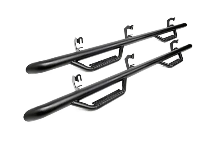 Rough Country's new Wheel to Wheel Nerf Steps provide unrelenting style and easier access to your truck. These steps extend from one wheel well opening to the next, offering a clean install that lends to the look of your lifted truck. These steps can be installed on any vehicle, with or without a body lift. Our innovative design actually hides any exposed frame you see under the truck, offering extra protection for your rocker panels. Rough Country Nerf Steps are Made out of ultra-durable .084 Wall corrosion resistant tubing with a Zinc Base Coat and Black Finish for a sharp look that's ready to withstand the elements. Rough Country Steps include a Lifetime Replacement Warranty!