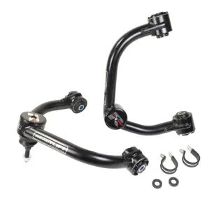 ReadyLIFT’s all-new Upper Control Arms provide the strength of a race-style uni-ball arm with the ride quality and characteristics of factory parts through the use of a newly designed High Angle Ball Joint. These new arms offer increased strength and travel for your suspension, with corrected geometry and alignment after your vehicle is lifted. The new UCA’s are designed for OE like ride quality on-road without the noise of traditional uni-ball arms. “Our proprietary pivot bushings used inside the control arm pocket, ReadyLIFT uses proprietary Terrain Control Technology bushings to ensure quiet, durable, and stable pivot performance. Finally, ReadyLIFT arms are powder-coated for an attractive yet durable finish combined with a sealed dust cap providing for years of quiet performance.