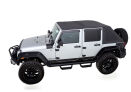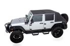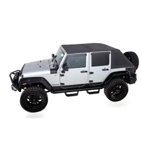 The Rampage Frameless Fastback installs over the original equipment factory roll bar for a snug fit. This unique design allows for larger side windows and improved visibility with removable side and rear windows that quickly convert the soft top into an open Safari top. Windows use heavy duty molded tooth zippers and are easily replaced or removed. The windows are also stored in a special separation panel between the ceiling and roof top which is concealed to protect the windows from scratches or puncture. The fastback style offers improved aerodynamics and a quieter ride than factory bow style tops. Includes door surrounds, fold-back hardware and tailgate bar.