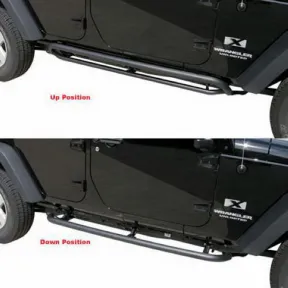 Retractable rockguard step Side Bar application designed for dual use as both an entry step and rocker panel side protection. Use as a side step for street use or release step lock to fold up to the rocker guard position for side protection and added off-road clearance. High pressure gas shocks pull and hold the bar in the upright, rocker guard position. Step pressure on the bar returns and locks the bar into the step bar position. Textured black powder coated finish is durable and compliments factory components. Durable steel construction - 2" tube x .120" wall.